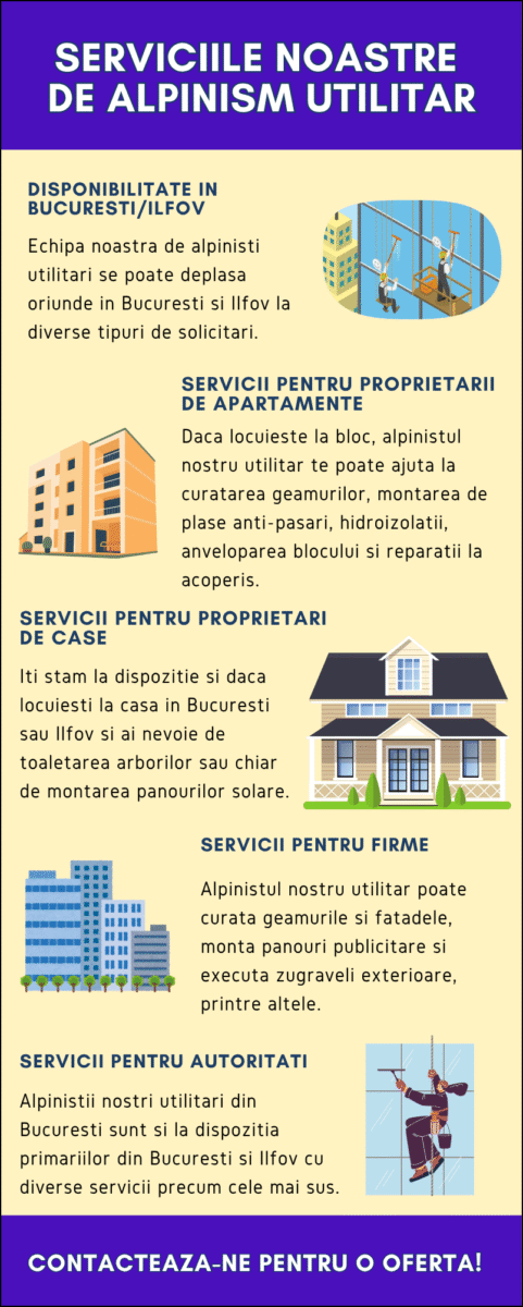 Serviciile de alpinism utilitar sunt din ce in ce mai solicitate, mai ales prin prisma faptului ca astfel de lucrari trebuie efectuate de profesionisti pentru a evita probleme ulterioare. Astfel, alpinistul nostru utilitar din Bucuresti este la dispozitia clientilor, persoane fizice si juridice, cu o gama variata de solutii disponibile atat in capitala, cat si in Ilfov. Descopera mai jos serviciile noastre, astfel incat sa iti dai seama cand poti aplea la noi.